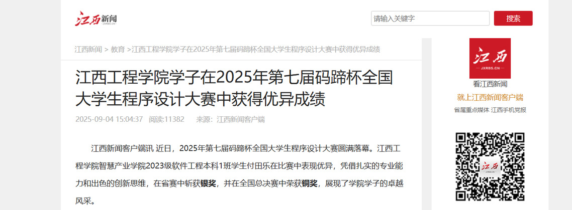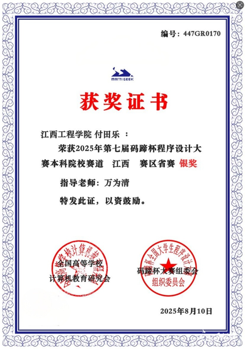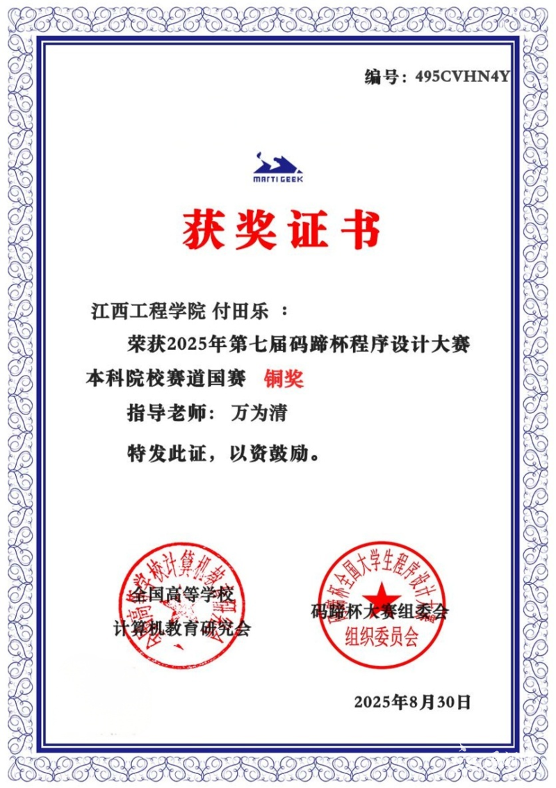 江西新聞客戶端訊近日,2025年第七屆碼蹄杯全國大學(xué)生程序設(shè)計大賽圓滿落幕。江西工程學(xué)院智慧產(chǎn)業(yè)學(xué)院2023級軟件工程本科1班學(xué)生付田樂在比賽中表現(xiàn)優(yōu)異,憑借扎實的專業(yè)能力和出色的創(chuàng)新思維,在省賽中斬獲銀獎,并在全國總決賽中榮獲銅獎,展現(xiàn)了學(xué)院學(xué)子的卓越風(fēng)采。