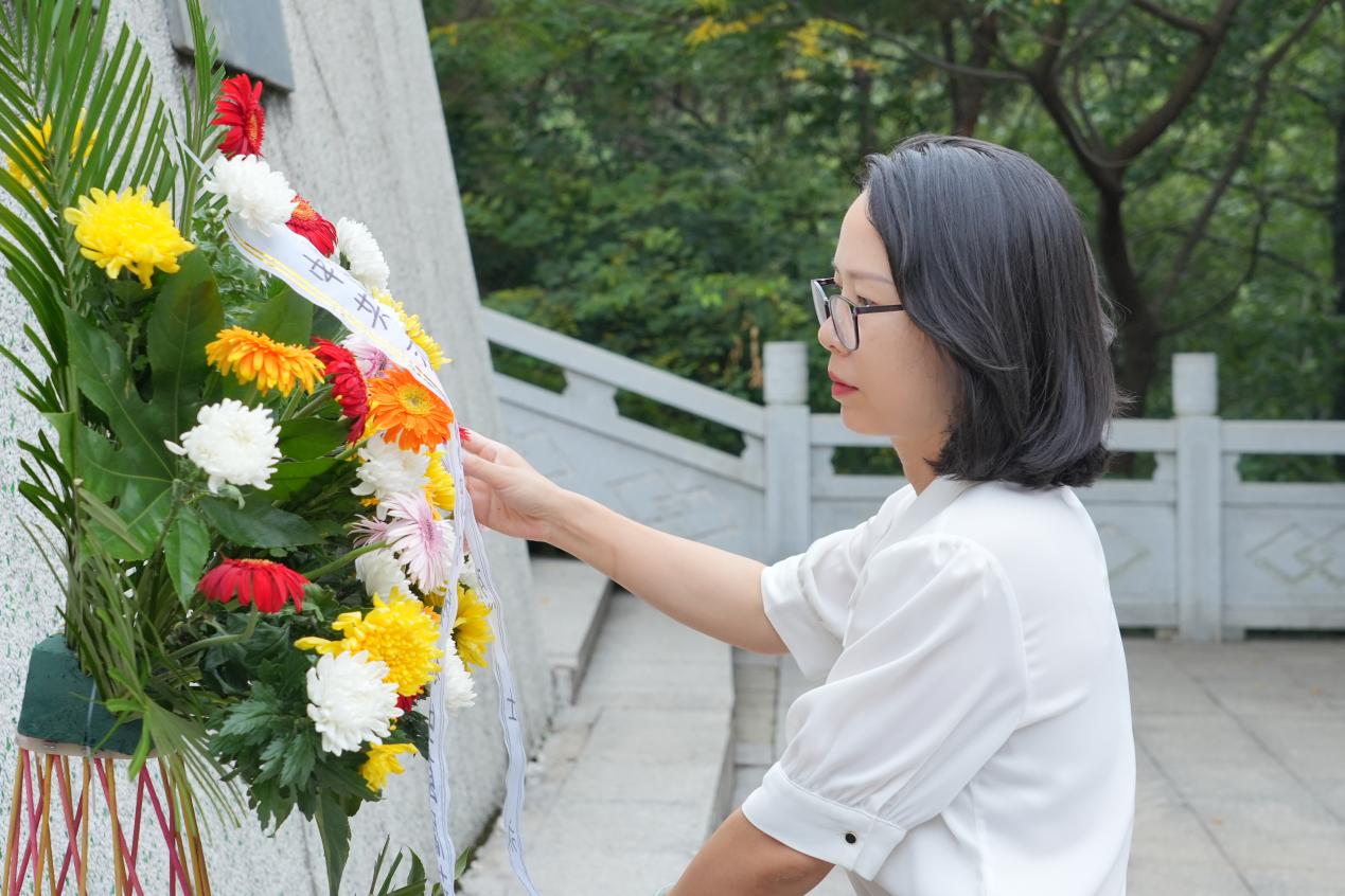 早上8點(diǎn)30分,機(jī)關(guān)黨總支、招生直屬黨支部全體黨員懷著無(wú)比崇敬的心情在仰天崗烈士紀(jì)念碑前列隊(duì)肅立默哀致敬,并向先烈敬獻(xiàn)花籃。熊文珍神情肅穆來(lái)到花籃前,俯身認(rèn)真整理緞帶,扶正挽聯(lián),以最崇高的敬意祭奠為中華人民共和國(guó)拋頭顱、灑熱血的革命先烈。