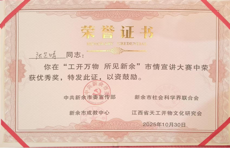 2025年10月下旬,由市委宣傳部、市社科聯(lián)、市成教中心、江西省天工開物文化研究會(huì)聯(lián)合主辦的“工開萬物 所見新余”市情宣講大賽經(jīng)過一天角逐圓滿收官。此次市情宣講大賽以“天工開物 所見新余”為主題,旨在挖掘新余歷史文化底蘊(yùn)、展現(xiàn)城市發(fā)展活力,鼓勵(lì)青年學(xué)子走進(jìn)家鄉(xiāng)、了解市情,用青春之聲講述城市故事。經(jīng)濟(jì)管理學(xué)院學(xué)子張芷晴憑借扎實(shí)的知識(shí)儲(chǔ)備、生動(dòng)的表達(dá)能力與深刻的市情理解,在眾多參賽選手中脫穎而出,榮獲大賽優(yōu)秀獎(jiǎng),為學(xué)院爭光添彩!