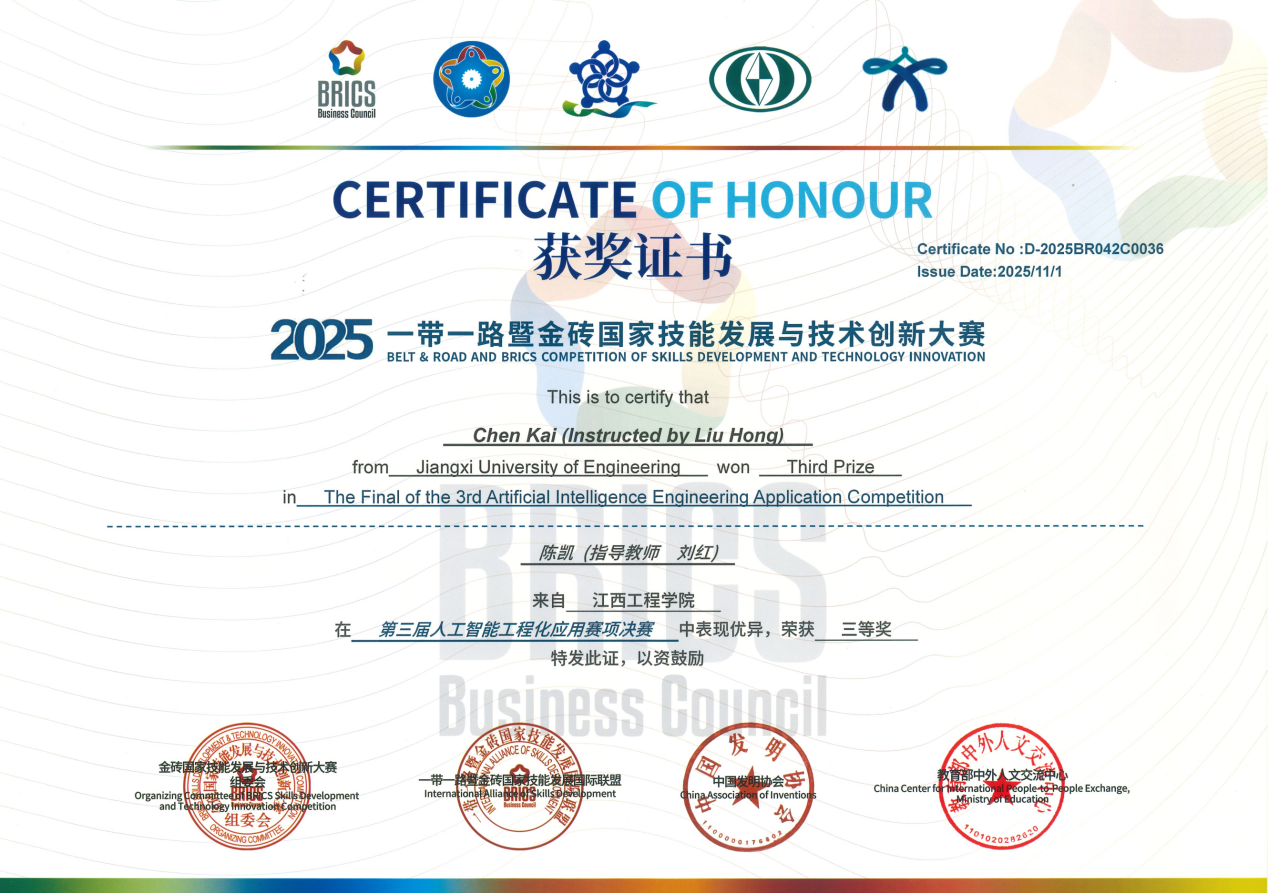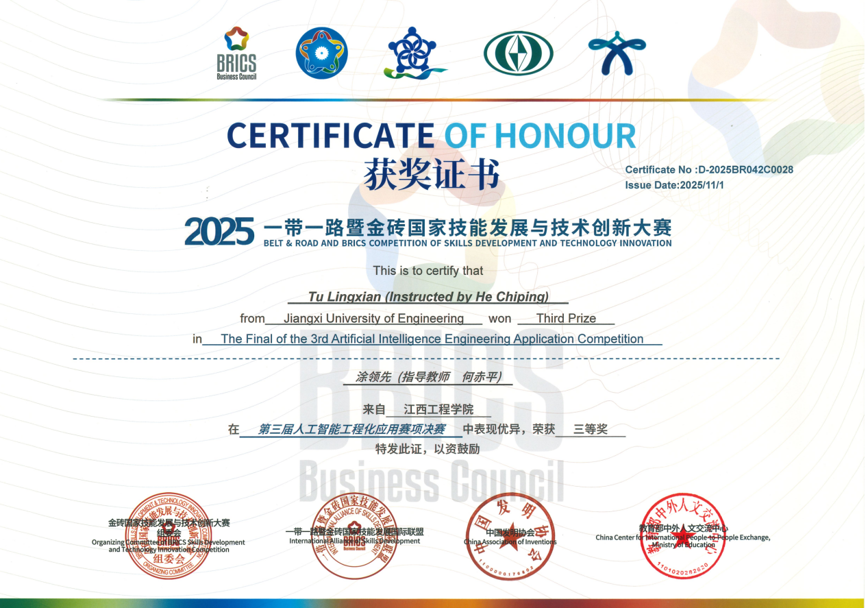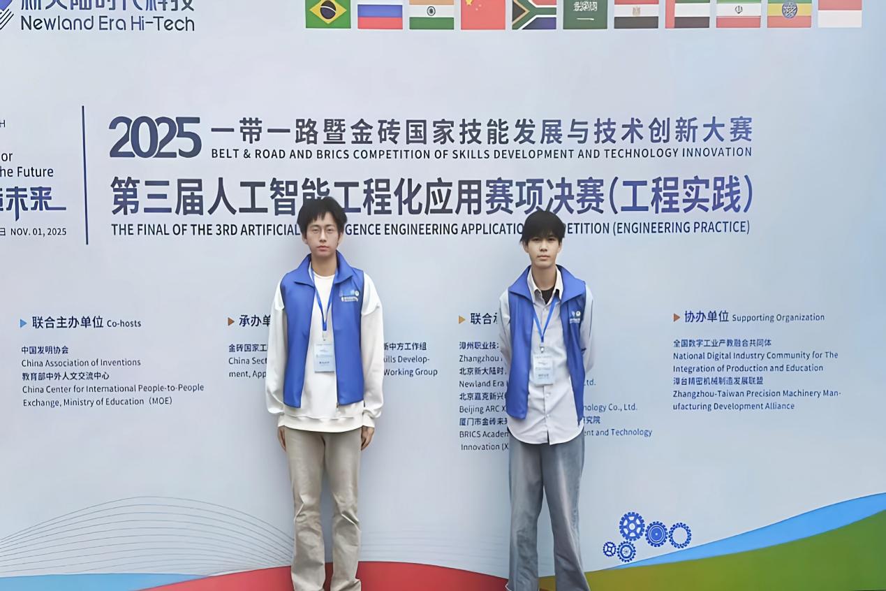 近日,2025年“一帶一路”暨金磚國家技能發(fā)展與技術(shù)創(chuàng)新大賽人工智能工程化應(yīng)用賽項總決賽在漳州職業(yè)技術(shù)學(xué)院舉行,經(jīng)過4小時的激烈角逐,我校人工智能與數(shù)據(jù)科學(xué)學(xué)院的涂領(lǐng)先、陳凱兩位同學(xué)表現(xiàn)優(yōu)異,首次參加并雙雙斬獲全國三等獎,充分展現(xiàn)了學(xué)校在AI工程化人才培養(yǎng)方面的扎實成效。