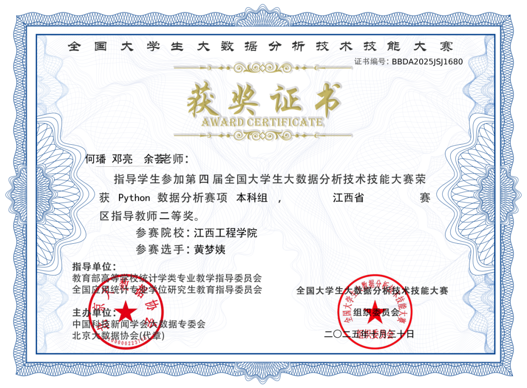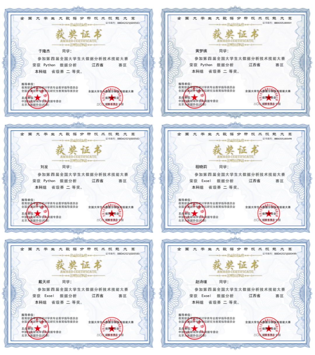 據(jù)悉,全國大學(xué)生大數(shù)據(jù)分析技術(shù)技能大賽是國內(nèi)大數(shù)據(jù)分析領(lǐng)域的權(quán)威賽事,也是教育部認可的84項學(xué)科競賽之一,大賽旨在檢驗和提升學(xué)生的大數(shù)據(jù)分析與應(yīng)用能力。此次比賽中,在何璠、鄧亮老師的悉心指導(dǎo)下,于隆杰、劉發(fā)、戴天祥、黃夢姨、趙詩瑾、程曉莉六位參賽學(xué)生積極備賽,在數(shù)據(jù)清洗、建模分析、可視化呈現(xiàn)等多個環(huán)節(jié)展現(xiàn)出過硬的專業(yè)素養(yǎng),均獲得省級二等獎。