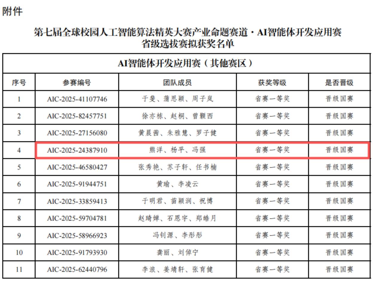 近日,2025年第七屆全球校園人工智能算法精英大賽產業(yè)命題賽道·AI智能體開發(fā)應用賽省級選拔賽獲獎名單正式公布。由江西工程學院科技處積極組織,在人工智能與數據科學學院郜永生老師的悉心指導下,參賽學生熊洋、楊平、馮強團隊榮獲省賽一等獎,并晉級國賽。