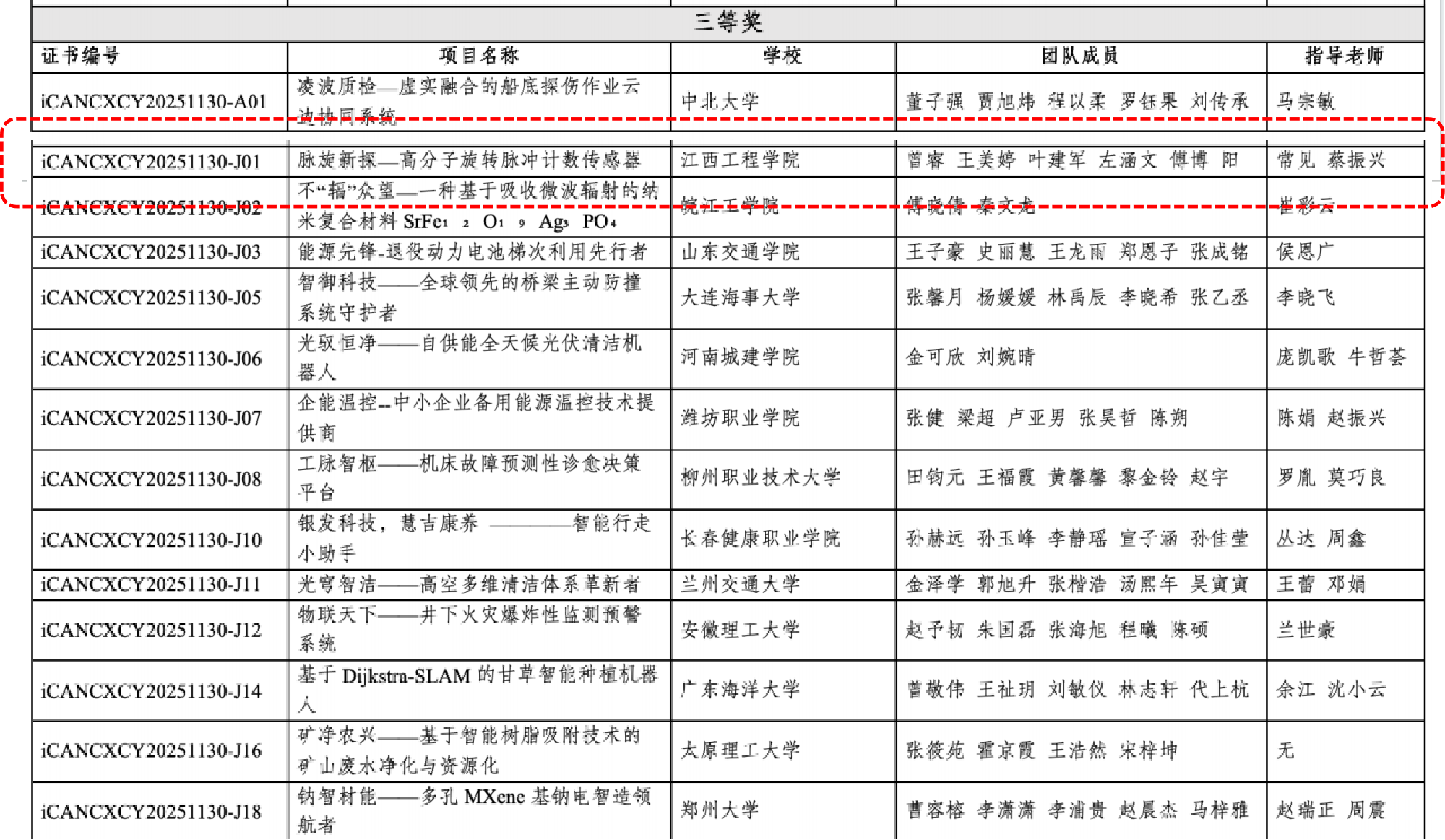 在總決賽現(xiàn)場,江西工程學院參賽團隊沉著冷靜,通過路演答辯與實物展示等環(huán)節(jié),充分展現(xiàn)了項目的創(chuàng)新性與實踐價值。參賽作品《脈旋新探—高分子旋轉(zhuǎn)脈沖計數(shù)傳感器》聚焦于新型傳感器與智能制造領域,針對傳統(tǒng)傳感器在特定工況下存在的痛點問題,創(chuàng)新性地采用了高分子導電材料與旋轉(zhuǎn)脈沖計數(shù)技術,該作品憑借獨特的設計理念、扎實的技術落地能力,贏得了現(xiàn)場評委的高度認可,最終榮獲創(chuàng)新賽道全國三等獎。