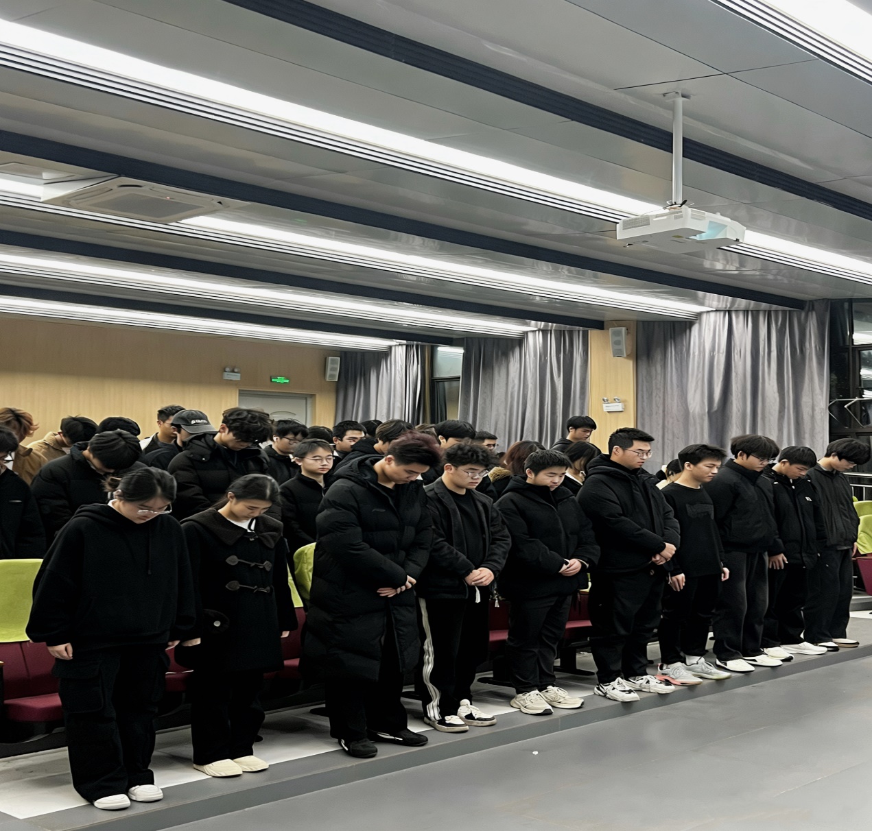 夜幕降臨,校團(tuán)委學(xué)生會(huì)組織學(xué)子們齊聚C208教室,開展國家公祭日主題觀影活動(dòng)。當(dāng)屏幕上浮現(xiàn)出南京大屠殺遇難同胞的紀(jì)念影像時(shí),同學(xué)們?nèi)w起立,低頭默哀。一分鐘的時(shí)間里,現(xiàn)場(chǎng)寂靜無聲,唯有沉重的歷史回響在每個(gè)人的心頭。同學(xué)們將對(duì)遇難同胞的深切緬懷、對(duì)和平的無限向往,都凝聚在這肅穆的一分鐘里,以最莊嚴(yán)的姿態(tài)告慰逝者,更在心底立下“銘記歷史、吾輩自強(qiáng)”的錚錚誓言。