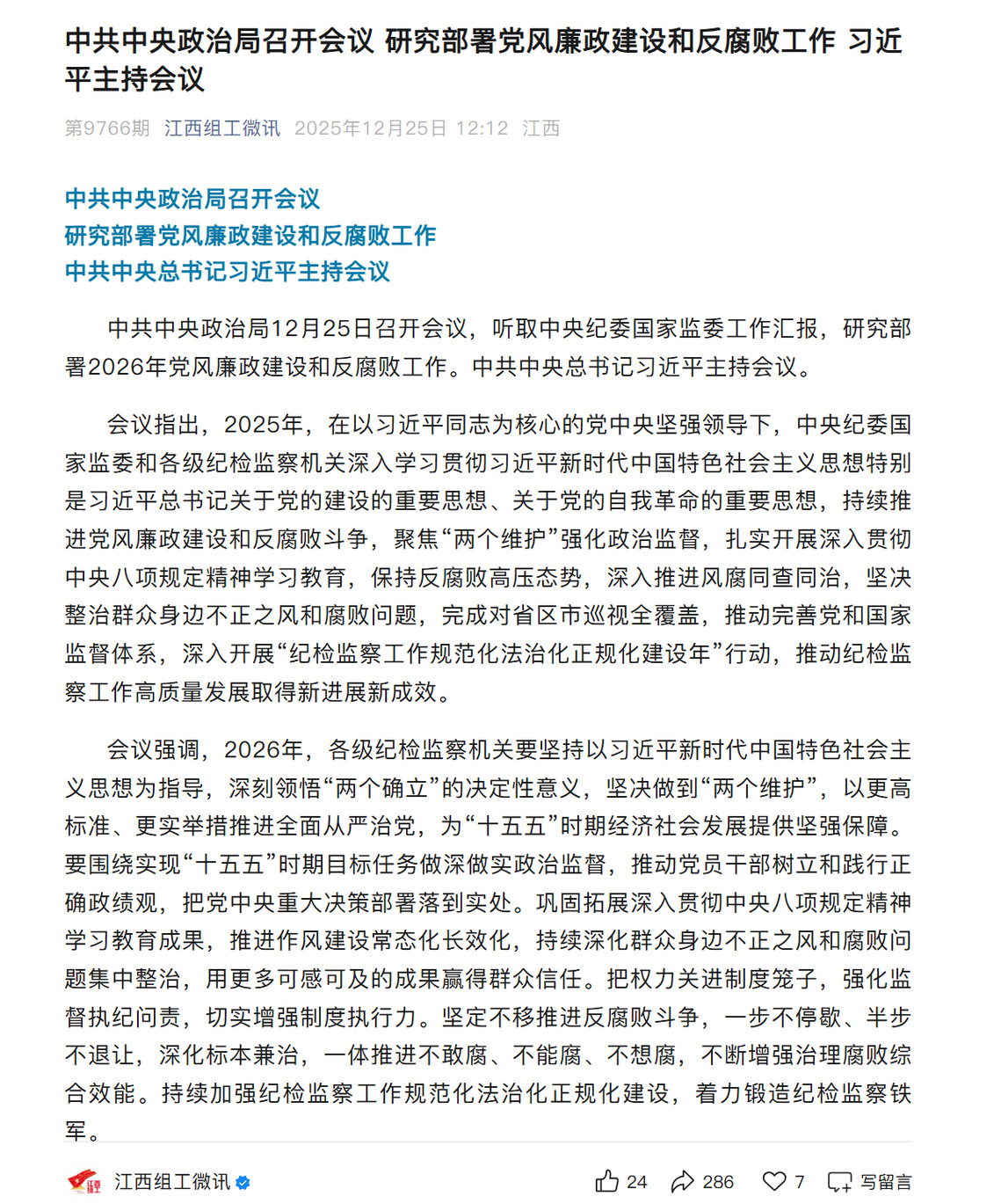 中共中央政治局12月25日召開會議,聽取中央紀(jì)委國家監(jiān)委工作匯報(bào),研究部署2026年黨風(fēng)廉政建設(shè)和反腐敗工作。中共中央總書記習(xí)近平主持會議。