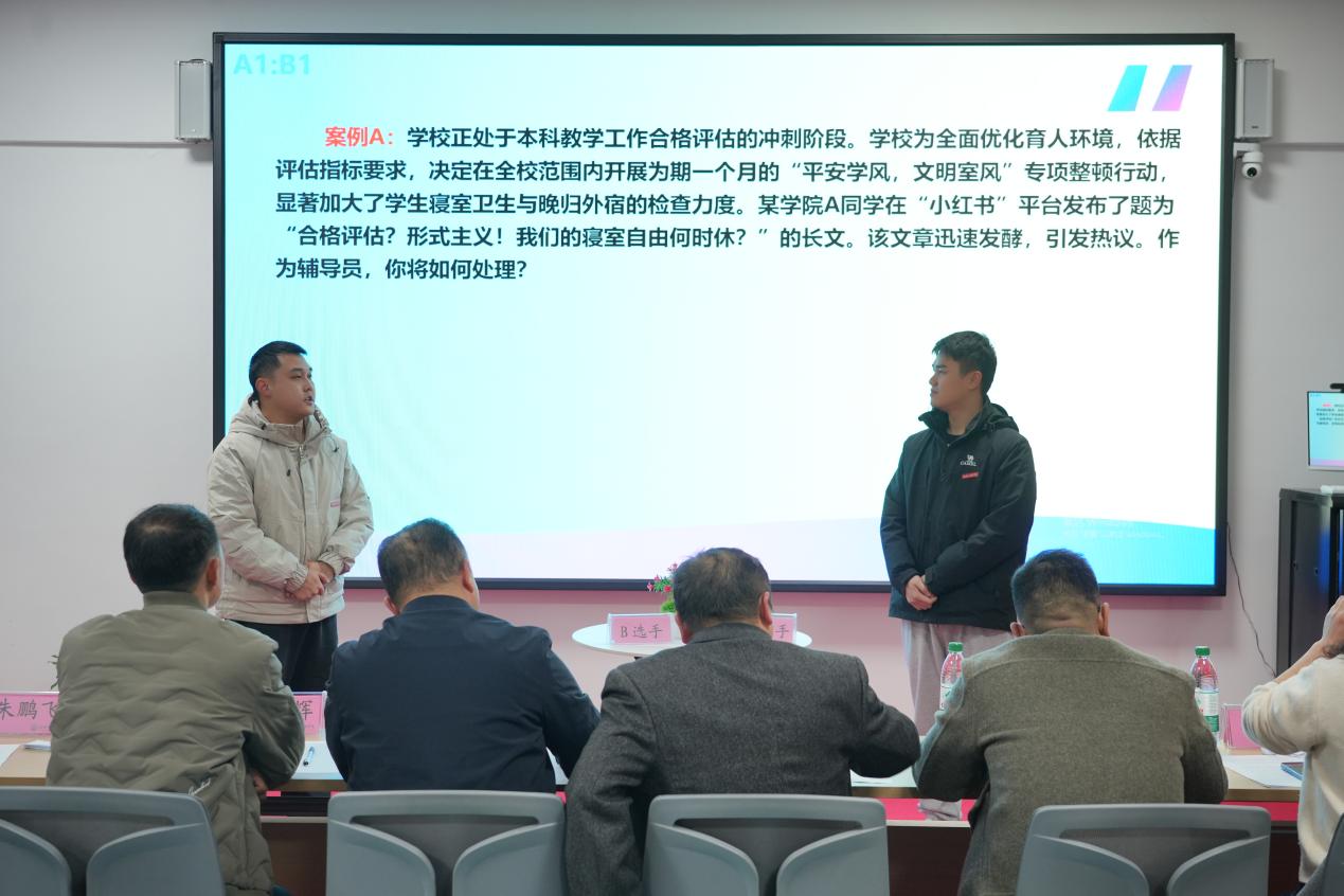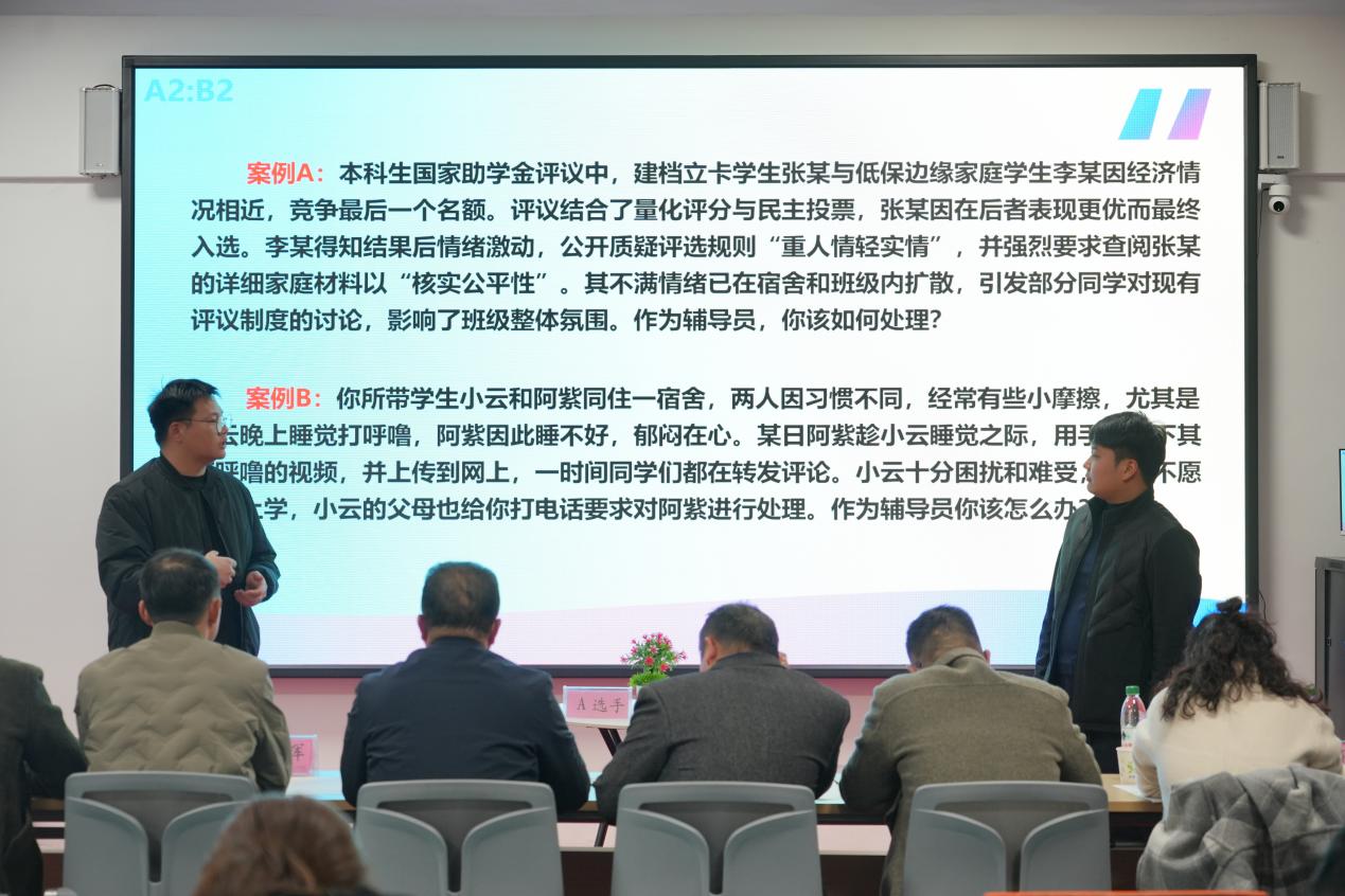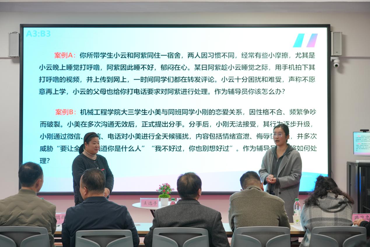 案例研討環(huán)節(jié)以“我提問(wèn),你回答”的創(chuàng)新形式開(kāi)展,參賽選手通過(guò)賽前抽簽確定分組與案例,圍繞學(xué)生管理中的典型問(wèn)題共同辨析原因、研討對(duì)策。選手們思路清晰、言之有據(jù),充分展現(xiàn)了分析問(wèn)題、研判問(wèn)題、解決問(wèn)題的專業(yè)能力,評(píng)委現(xiàn)場(chǎng)提問(wèn)環(huán)節(jié)更凸顯了臨場(chǎng)應(yīng)變與深度思考能力。