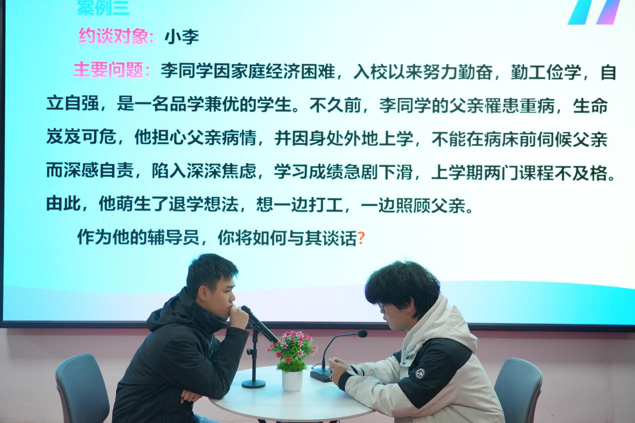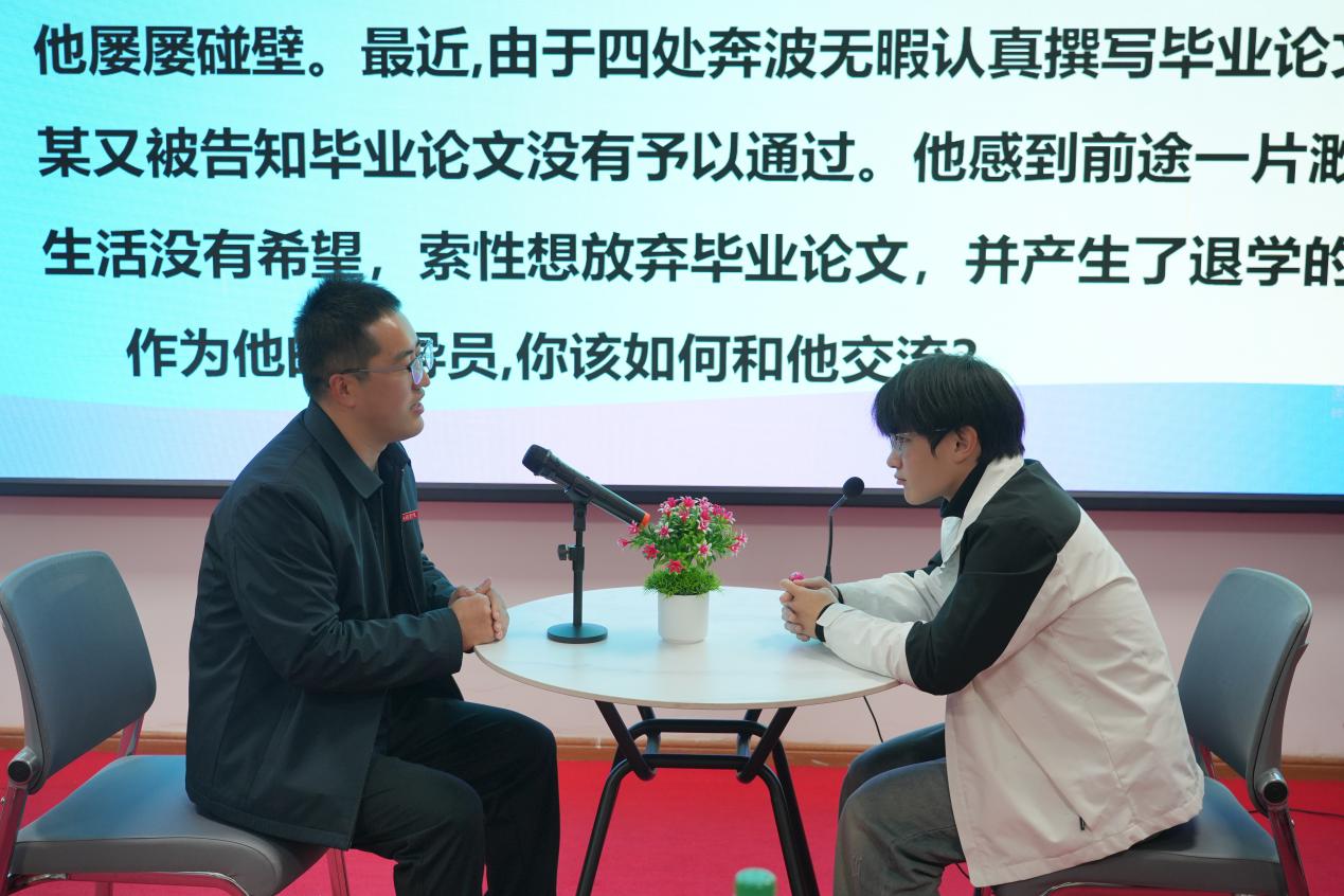 談心談話環(huán)節(jié)中,選手們提前抽題,遵循“人題匹配、同院規(guī)避”原則與學(xué)生模擬溝通,以真誠(chéng)的態(tài)度、專業(yè)的技巧化解學(xué)生困惑,談話后的總結(jié)反思與評(píng)委問(wèn)答,進(jìn)一步彰顯了輔導(dǎo)員對(duì)學(xué)生成長(zhǎng)規(guī)律的把握與教育引導(dǎo)能力。