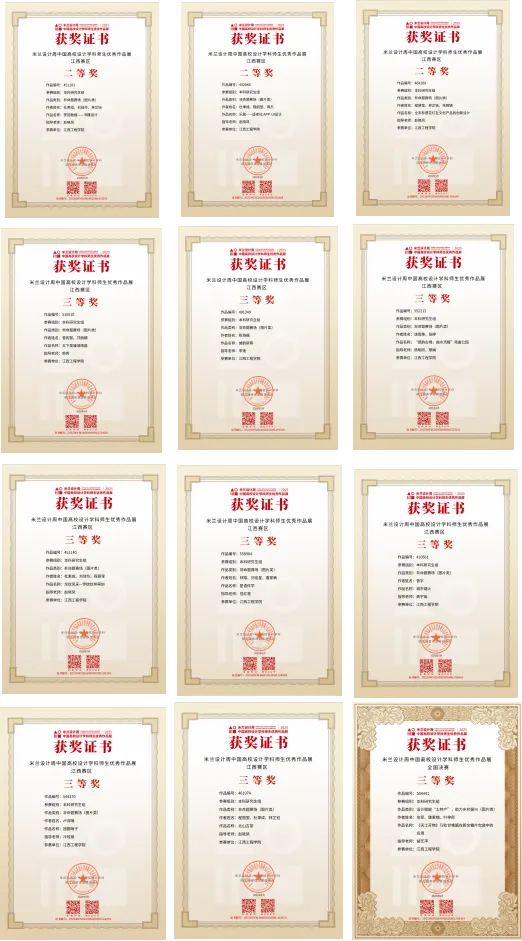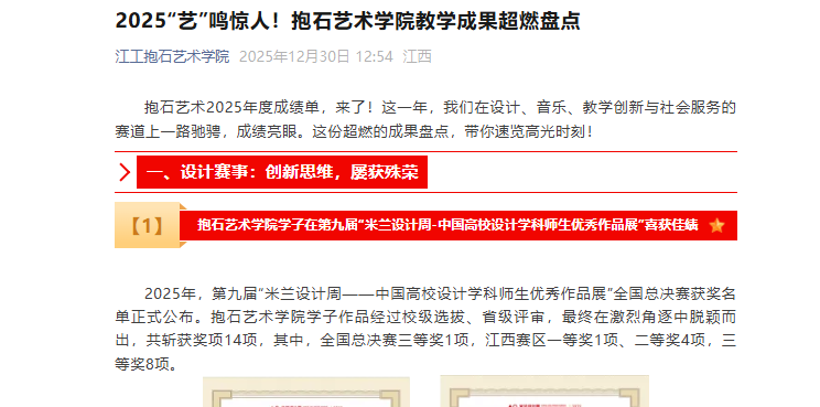 2025年,第九屆“米蘭設(shè)計(jì)周——中國(guó)高校設(shè)計(jì)學(xué)科師生優(yōu)秀作品展”全國(guó)總決賽獲獎(jiǎng)名單正式公布。抱石藝術(shù)學(xué)院學(xué)子作品經(jīng)過(guò)校級(jí)選拔、省級(jí)評(píng)審,最終在激烈角逐中脫穎而出,共斬獲獎(jiǎng)項(xiàng)14項(xiàng),其中,全國(guó)總決賽三等獎(jiǎng)1項(xiàng),江西賽區(qū)一等獎(jiǎng)1項(xiàng)、二等獎(jiǎng)4項(xiàng),三等獎(jiǎng)8項(xiàng)。