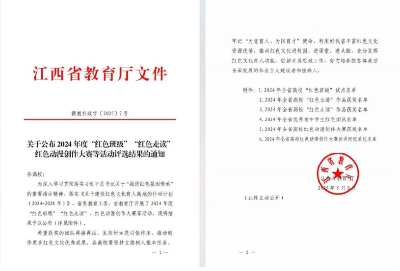 2025年5月,江西省教育廳公布了2024年度“紅色班級(jí)”“紅色走讀”紅色動(dòng)漫創(chuàng)作大賽等活動(dòng)評(píng)選結(jié)果的通知。抱石藝術(shù)學(xué)院《江西紅色走讀:記憶中的烽火歲月》作品獲全省高校二等獎(jiǎng)。
