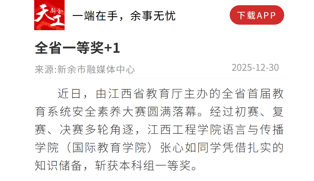 近日,由江西省教育廳主辦的全省首屆教育系統(tǒng)安全素養(yǎng)大賽圓滿落幕。經(jīng)過初賽、復(fù)賽、決賽多輪角逐,江西工程學(xué)院語言與傳播學(xué)院(國際教育學(xué)院)張心如同學(xué)憑借扎實的知識儲備,斬獲本科組一等獎。