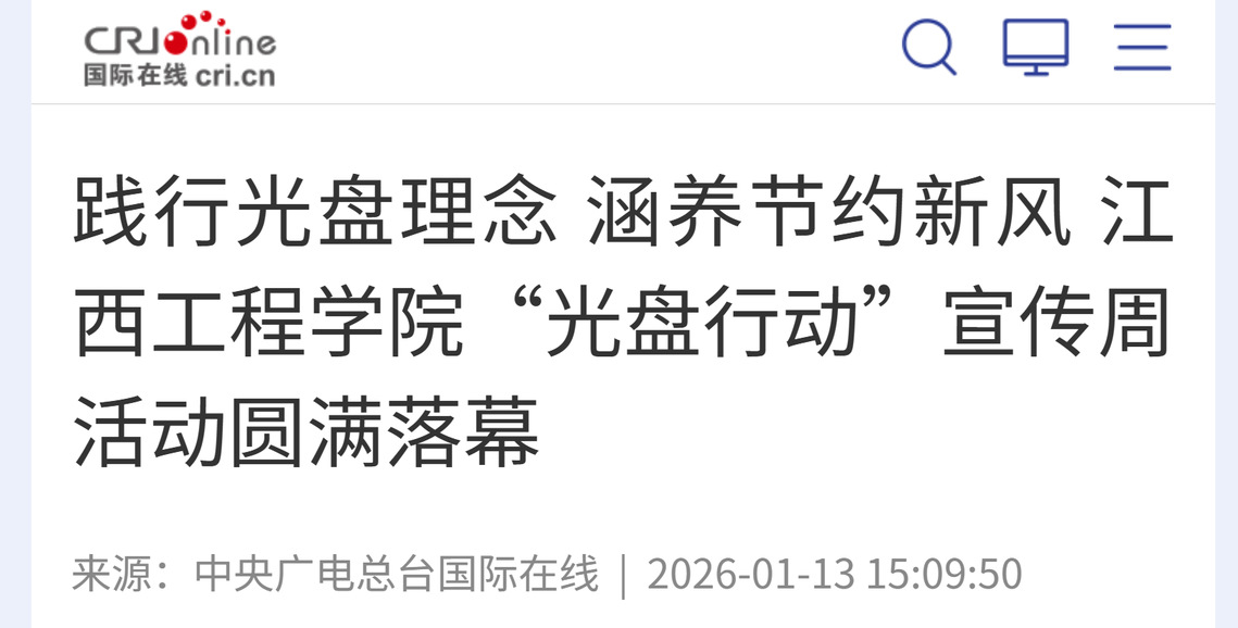 為深入貫徹厲行節(jié)約、反對浪費的理念,引導全體教職工養(yǎng)成珍惜糧食的良好習慣,江西工程學院于2025年12月29日至2026年1月6日開展“光盤行動”宣傳周暨持續(xù)踐行活動?;顒佑尚9?、后勤處聯(lián)合主辦,職能部門、各學院(部)及校園廣播臺協(xié)辦,全體教職工積極參與,取得了顯著成效。