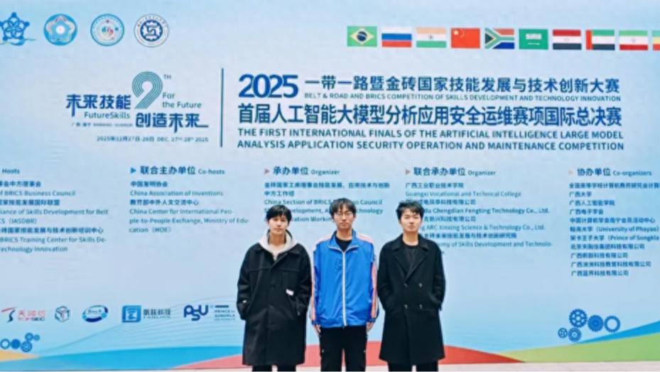 近日,2025年“一帶一路”暨金磚國家技能發(fā)展與技術(shù)創(chuàng)新大賽首屆人工智能大模型分析應(yīng)用安全運(yùn)維賽項(xiàng)國際總決賽在廣西南寧圓滿落幕。這場(chǎng)匯聚多個(gè)國家和地區(qū)頂尖院校的國際頂級(jí)賽事,我校人工智能與數(shù)據(jù)科學(xué)學(xué)院參賽團(tuán)隊(duì)(楊鈞、涂領(lǐng)先、陳凱),憑借自主研發(fā)的原創(chuàng)大模型,在激烈角逐中脫穎而出,成功斬獲國際總決賽二等獎(jiǎng),并榮獲優(yōu)秀組織獎(jiǎng),為學(xué)校贏得了榮譽(yù),充分彰顯了江工學(xué)子在人工智能領(lǐng)域的過硬實(shí)力與創(chuàng)新風(fēng)采!