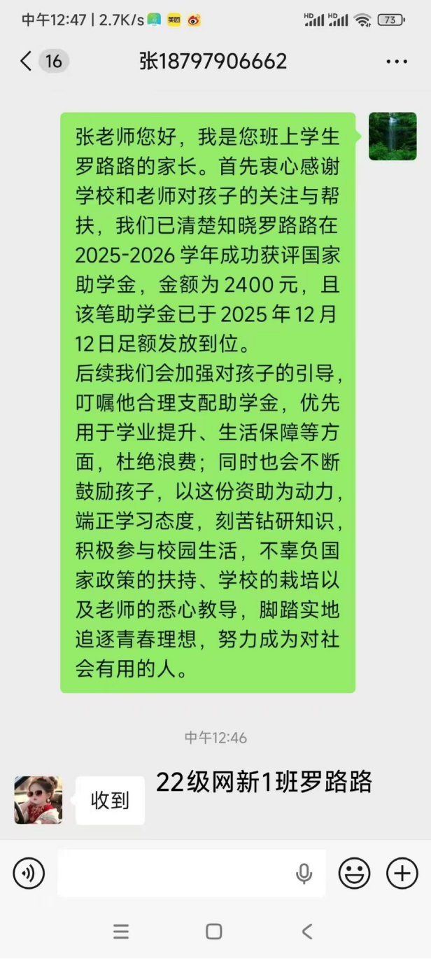 資助是手段,育人是目的。我校深刻認(rèn)識(shí)到,資助工作絕不能止于“發(fā)錢(qián)”,更重要的在于“育人”,在于傳遞溫暖、激發(fā)動(dòng)力、凝聚合力。為此,在2025年秋季學(xué)期資助資金發(fā)放完成后,學(xué)校創(chuàng)新工作方式,主動(dòng)將“喜報(bào)”送到家,將“佳音”傳至親。