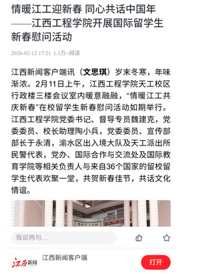 據(jù)悉,江西工程學(xué)院現(xiàn)有來(lái)自36個(gè)國(guó)家的200余名在籍外國(guó)留學(xué)生。學(xué)校始終以促進(jìn)中外文化交流為己任,常態(tài)化開(kāi)展傳統(tǒng)節(jié)日沉浸式體驗(yàn)、語(yǔ)言技能競(jìng)賽、跨文化實(shí)踐研學(xué)等活動(dòng),引導(dǎo)留學(xué)生深入了解中國(guó)、熱愛(ài)中國(guó)。新年新征程,學(xué)校將持續(xù)深化校地文化融合,推進(jìn)留學(xué)生校史校情教育常態(tài)化建設(shè),讓留學(xué)生們成為中外友好交流的堅(jiān)實(shí)橋梁,為江工文化與中華文化的國(guó)際傳播注入持久動(dòng)力。