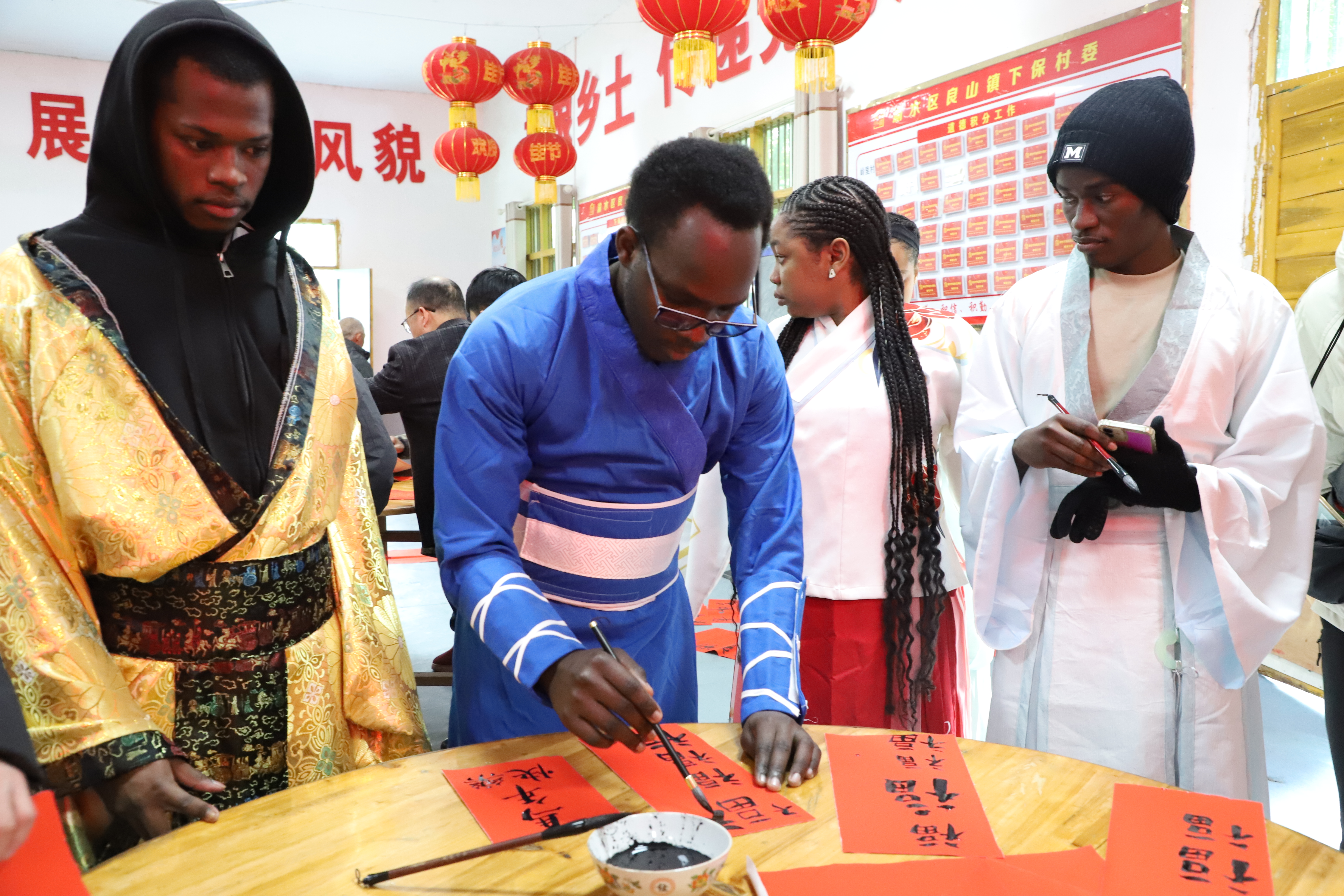 2月2日下午,江西工程學(xué)院馬克思主義學(xué)院聯(lián)合語(yǔ)言與傳播學(xué)院(國(guó)際教育學(xué)院)、黨辦、圖書館等單位走進(jìn)新余市良山鎮(zhèn)下保村,共同舉辦“新春添年味,筆墨送祝?!被顒?dòng)。學(xué)校帶領(lǐng)來(lái)自尼日利亞、津巴布韋、巴基斯坦、剛果(金)、剛果(布)等國(guó)家的10名外國(guó)留學(xué)生走進(jìn)這座全國(guó)鄉(xiāng)村旅游重點(diǎn)村,揮毫潑墨、書寫春聯(lián),在一撇一捺中感受中國(guó)傳統(tǒng)年俗文化魅力。
