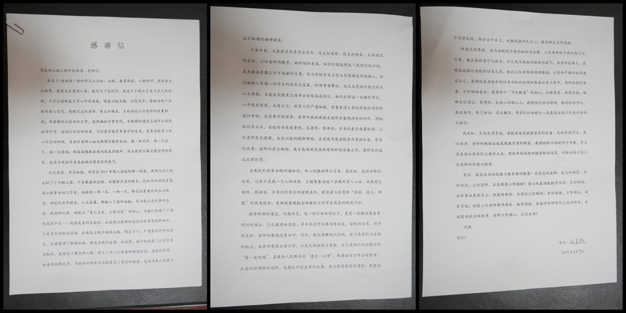近日,江西工程學(xué)院2011級計算機(jī)網(wǎng)絡(luò)技術(shù)專業(yè)學(xué)子江會權(quán)順利通過上海市公安局政審環(huán)節(jié),成功入職上海市公安局監(jiān)管總隊(duì),在基層公安事業(yè)的道路上開啟全新征程。喜訊傳來,江會權(quán)滿懷感恩之情寫下感謝信,向母校江西工程學(xué)院及范志紅老師、熊文珍部長、王娟書記致以最誠摯的謝意,細(xì)數(shù)母校培育之恩與恩師幫扶之情。