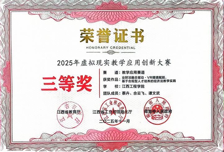 [13]江西省2025年虛擬現(xiàn)實(shí)教學(xué)應(yīng)用創(chuàng)新大賽教學(xué)應(yīng)用賽道三等獎(jiǎng),2025年11月。