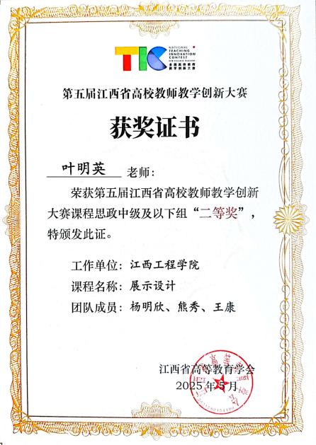 作為抱石藝術(shù)學(xué)院教學(xué)骨干,葉明英緊扣評估指標(biāo)體系,在教學(xué)模式創(chuàng)新上持續(xù)發(fā)力,推動設(shè)計(jì)教育改革與學(xué)院內(nèi)涵建設(shè)同頻共振。課程采用“模擬方案競標(biāo)”模式,由校內(nèi)教師與企業(yè)方共同評審方案。學(xué)生以小組形式完成從“調(diào)研——策劃——設(shè)計(jì)——接洽——調(diào)整——搭建”的全鏈條實(shí)戰(zhàn),在真實(shí)項(xiàng)目中提升落地能力。2025年,她憑借“社會大美育視角下的展示設(shè)計(jì)課程項(xiàng)目式教學(xué)創(chuàng)新”榮獲第五屆江西省教學(xué)創(chuàng)新大賽二等獎,課程獲評2項(xiàng)校級課程思政優(yōu)秀案例,教學(xué)團(tuán)隊(duì)獲評校級思政示范教學(xué)團(tuán)隊(duì),為學(xué)校在評估中展現(xiàn)抱石藝術(shù)學(xué)院教學(xué)特色提供了有力支撐。